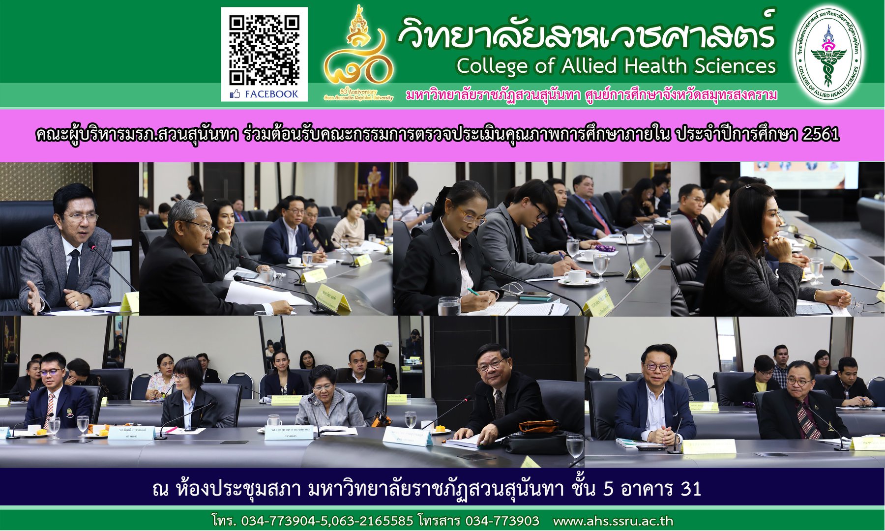 17 October 2019 (08.30-12.00 hrs.) Dr. Pannee Rojanapakun, Deputy Dean for Planning and Quality Assurance College of Allied Health Sciences Assigned by the Dean Participate in the internal education quality assessment Of Suan Sunandha Rajabhat University For the year 2018, there are 3 year-old students, namely, Ms. Ratchadawan Khamchan, alumni, Mr. Sarawut Isaro and Ajarn Jirawat Sudsawad, being interviewed by the Audit Committee. With Associate Professor Dr. Ruedet Kerdwichai, President and University Executives Attended the audit meeting at the University Council meeting room, Floor 5, Building 31