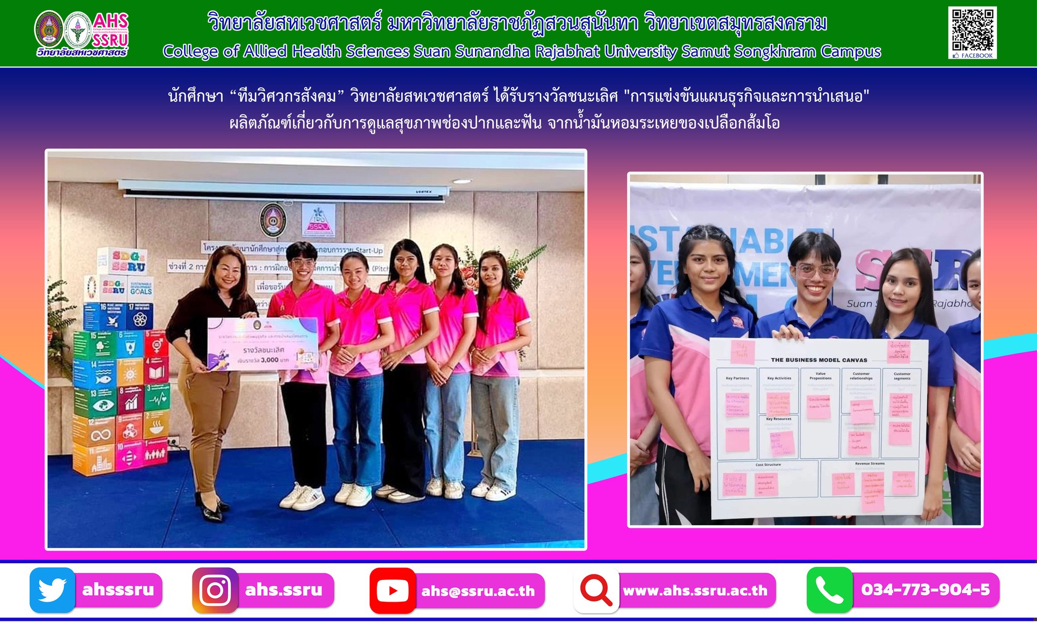 In addition, the students of the Social Engineering team of the College of Allied Health Sciences participated in the business plan and presentation competition and won the "Business Plan and Presentation Competition" award from a total of 10 competing teams by presenting oral and dental care products from essential oils from pomelo peels and became the university's representatives in the national competition.