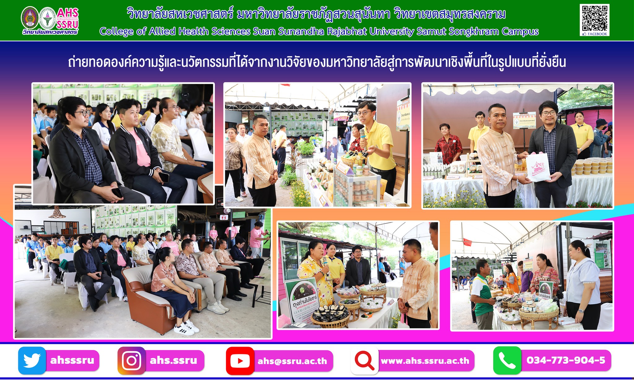 Associate Professor Dr. Thanawat Chaipongphatchara, Deputy Dean for Research and Academic Services, College of Allied Health Sciences, Suan Sunandha Rajabhat University, Samut Songkhram Campus, along with faculty, staff, students, and community leaders, participated in the "2nd Market in the Garden" event to promote the transfer of knowledge and innovations derived from university research into sustainable local development. This event aims to enhance the quality and competitiveness of community products and to create a stable local grassroots economy through close collaboration between the academic and public sectors.