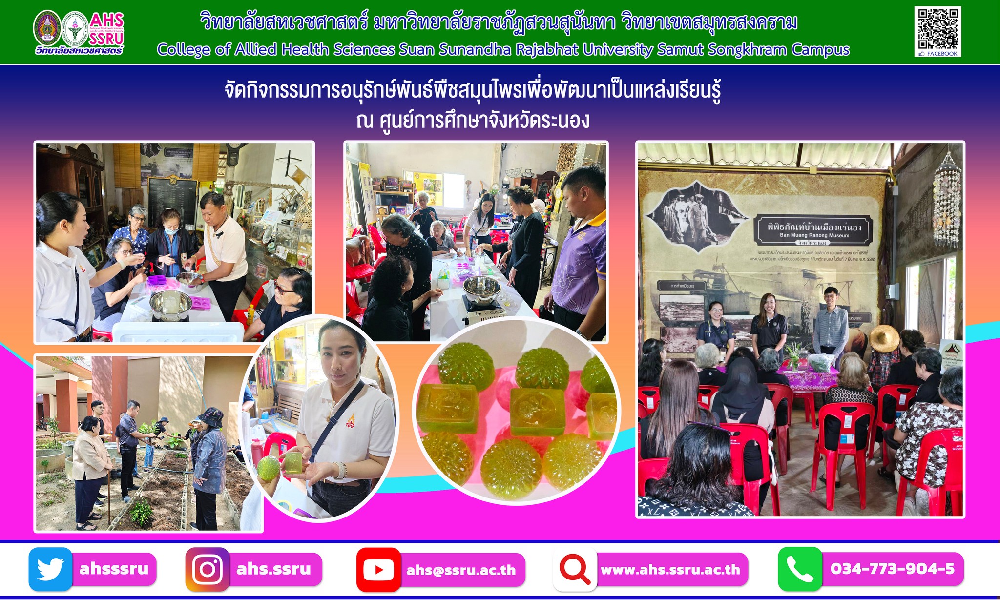 เข้าร่วมจัดกิจกรรมการอนุรักษ์พันธ์พืชสมุนไพรเพื่อพัฒนาเป็นแหล่งเรียนรู้ ณ ศูนย์การศึกษาจังหวัดระนอง และการใช้ประโยชน์จากพืชสมุนไพรมาพัฒนาผลิตภัณฑ์สบู่ ณ ชุมชนบ้านบางริ้น อ.เมือง จ.ระนอง