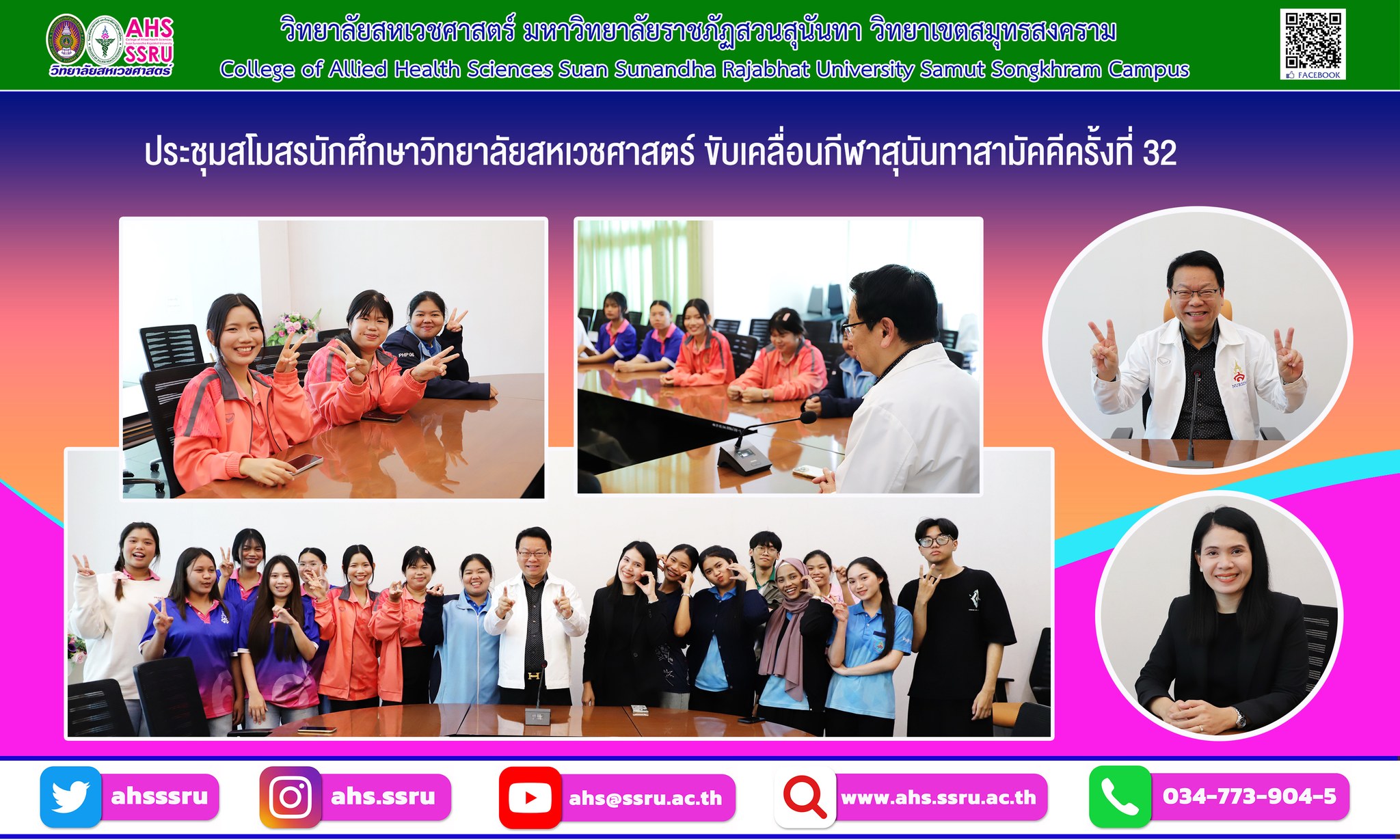 เข้าร่วมประชุมกับคณะสโมสรนักศึกษาวิทยาลัยสหเวชศาสตร์ เพื่อขับเคลื่อนงานกีฬาสวนสุนันทาสามัคคี ครั้งที่ 32 มอบขวัญกำลังใจกับคณะสโมสรนักศึกษาและนักศึกษาวิทยาลัยสหเวชศาสตร์ ในการแข่งกีฬาสุนันทาสามัคคีในปีนี้ เตรียมจัดขบวนพาเหรด ประกวดทีมเชียร์ และเชียร์ลีดเดอร์เต็มที่ ในพิธีปิดวันอาทิตย์ที่ 21 ธันวาคม 2568 ณ สนามกีฬามหาวิทยาลัยราชภัฏสวนสุนันทา วิทยาเขตนครปฐม