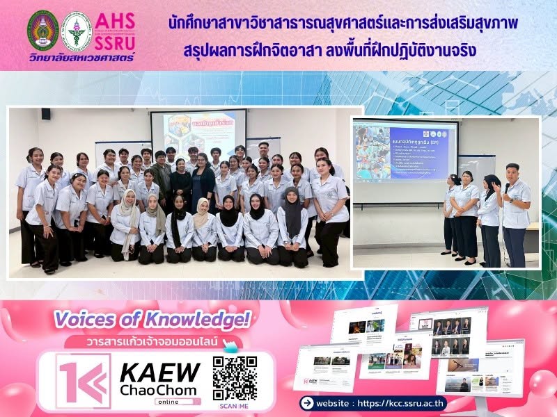 นักศึกษาได้ถ่ายทอดประสบการณ์จริงจากการลงพื้นที่ฝึกปฏิบัติงาน พร้อมทั้งแลกเปลี่ยนเรียนรู้แนวทางการส่งเสริมสุขภาพ การป้องกันโรค และการดูแลประชาชนในชุมชนอย่างเป็นระบบ ทักษะด้านการวิเคราะห์ การสื่อสาร และการนำเสนอผลงานทางวิชาการ ซึ่งเป็นทักษะสำคัญในการประกอบวิชาชีพด้านสาธารณสุข เมื่อวันที่ 31 มีนาคม 2569 ที่ผ่านมา