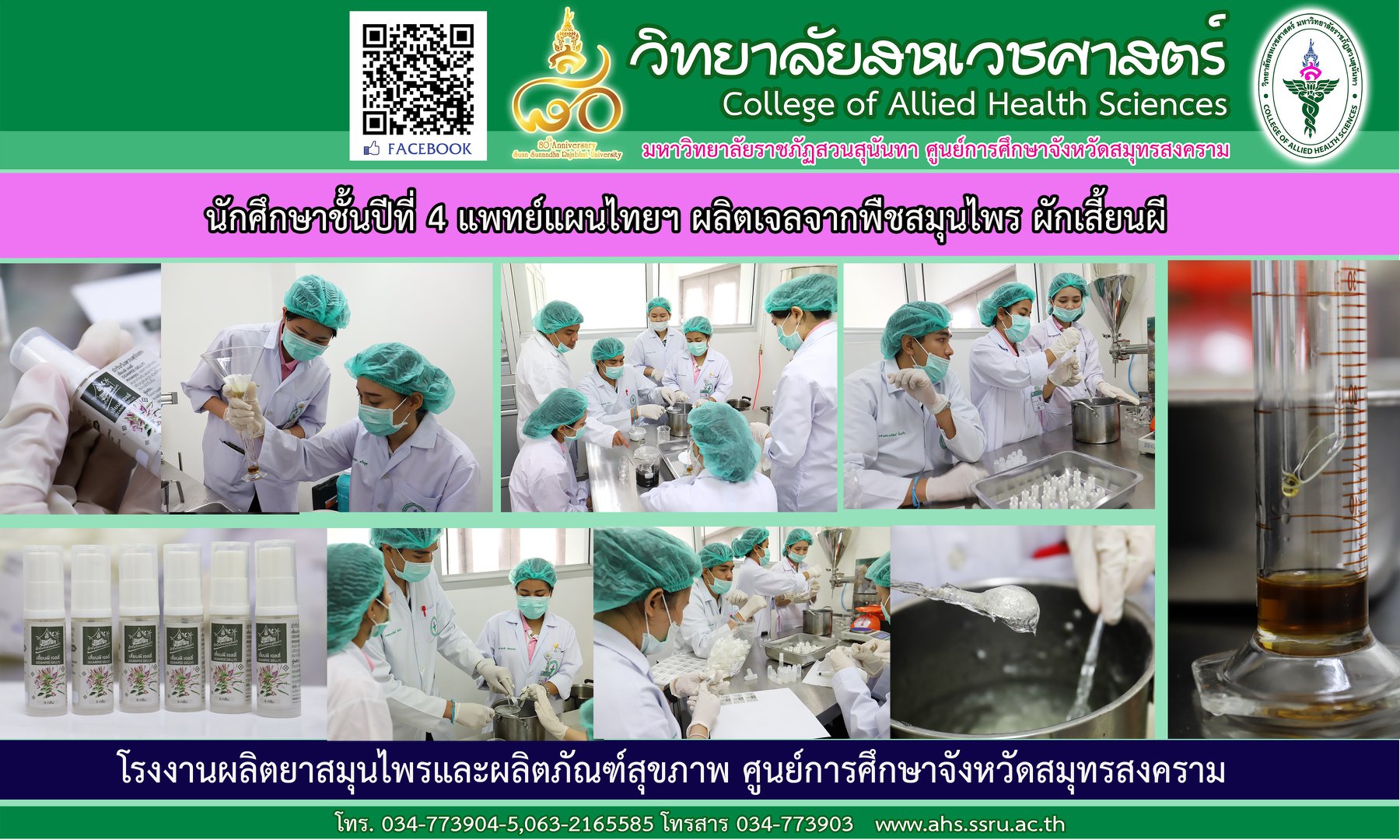 วันที่ 1 ตุลาคม 2562 อาจารย์นรินทร์ กากะทุม หัวหน้าสาขาวิชาการแพทย์แผนไทยประยุกต์ ให้นักศึกษาชั้นปีที่ 4 ได้ฝึกปฏิบัติการผลิต เจลจากพืชสมุนไพรเสี้ยนผี ที่มีสรรพคุณลดการอักเสบ เพิ่มความชุ่มชื้นแก่ผิวซึ่งเป็นผลงานนวัตกรรมงานวิจัย ต่อยอดจากงานวิจัย ของรองศาสตราจารย์ พญ.ดวงพร นะคาพันธุ์ชัย สู่ผลิตภัณฑ์ของทางวิทยาลัยสหเวชศาสตร์ ณ โรงงานผลิตยาสมุนไพรและผลิตภัณฑ์สุขภาพ วิทยาลัยสหเวชศาสตร์ ศูนย์การศึกษาจังหวัดสมุทรสงคราม