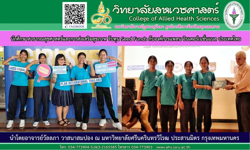 วันที่ 11 ตุลาคม 2562 อาจารย์วัลลภา วาสนาสมปอง นำทีมนักศึกษาสาขาวิชาสาธารณสุขศาสตร์และการส่งเสริมสุขภาพ ชั้นปีที่ 1 เข้าร่วมงานวันเด็กผู้หญิงสากล และ ได้รับคัดเลือกให้รับทุน Seed Funds เพื่อจัดกิจกรรมส่งเสริมความความเท่าเทียม ภายใต้แคมเปญ Girls Get Equal กับองค์การแพลน อินเตอร์เนชั่นแนล ประเทศไทย โดยมี Mr. Staffan Herrström เอกอัครราชทูตสวีเดนประจำประเทศไทย เป็นประธานในพิธี ณ มหาวิทยาลัยศรีนครินทรวิโรฒ ประสานมิตร กรุงเทพมหานคร
