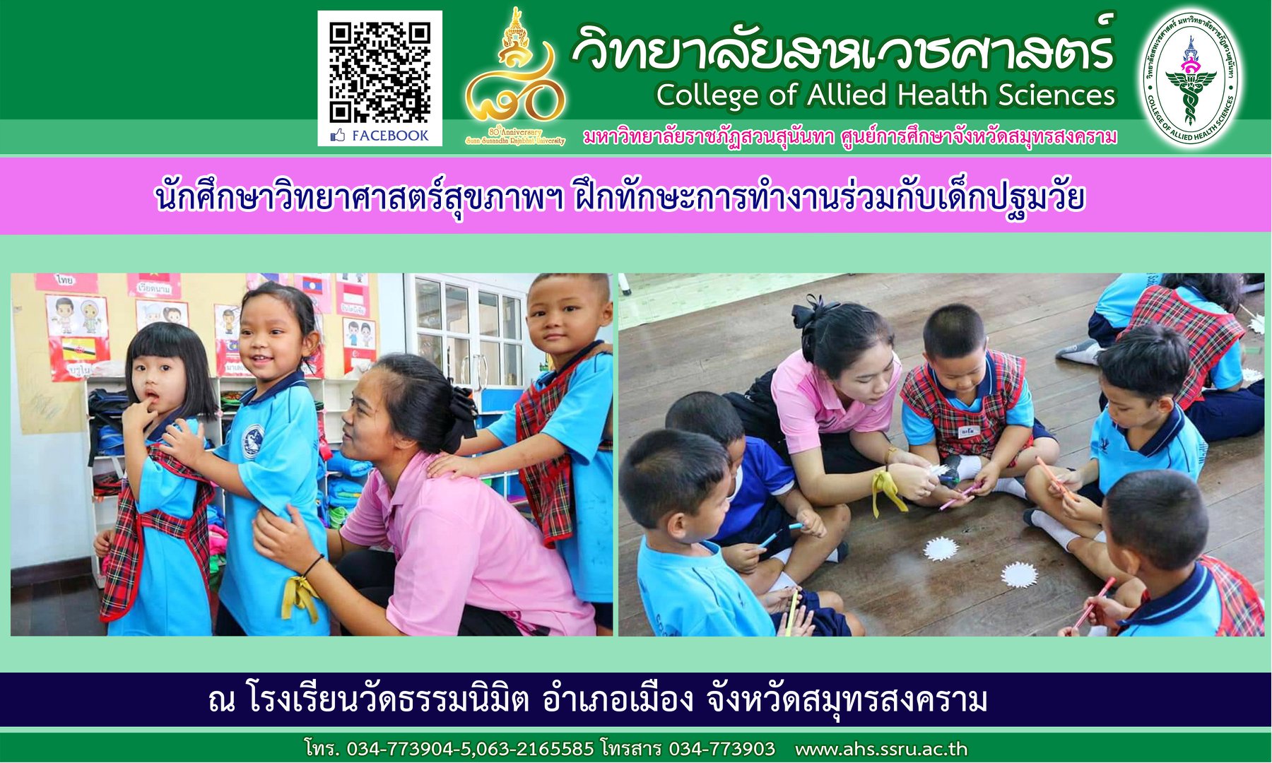 วันที่ 20 พฤศจิกายน 2562 อาจารย์วัลลภา วาสนาสมปอง อาจารย์ประจำสาขาสาธารณสุขศาสตร์และการส่งเสริมสุขภาพ วิทยาลัยสหเวชศาสตร์ มหาวิทยาลัยราชภัฏสวนสุนันทา ศูนย์การศึกษาจังหวัดสมุทรสงครามนำนักศึกษาวิทยาศาสตร์สุขภาพ จัดกิจกรรม “พี่ชวนน้องเล่นเสริมสร้างความคิดสร้างสรรค์” วิชาการพัฒนาความคิดสร้างสรรค์ในเด็กปฐมวัย ให้กับนักเรียนชั้นอนุบาล 1-3 โรงเรียนเทศบาลวัดธรรมนิมิต เพื่อเป็นการฝึกทักษะการทำงานร่วมกับเด็กปฐมวัย และออกแบบกิจกรรมเพื่อพัฒนาความคิดสร้างสรรค์ ได้แก่ กิจกรรมเข้าจังหวะเคลื่อนไหวอย่างสร้างสรรค์ การสร้างสื่อกระดาษ การเล่าเรื่องราวผ่านผลงาน storytelling และฟังนิทานหรรษา งานนี้ทั้งพี่ๆและน้องๆต่างเต็มไปด้วยรอยยิ้มที่แสนเบิกบาน ณ โรงเรียนเทศบาลวัดธรรมนิมิต อำเภอเมือง จังหวัดสมุทรสงคราม