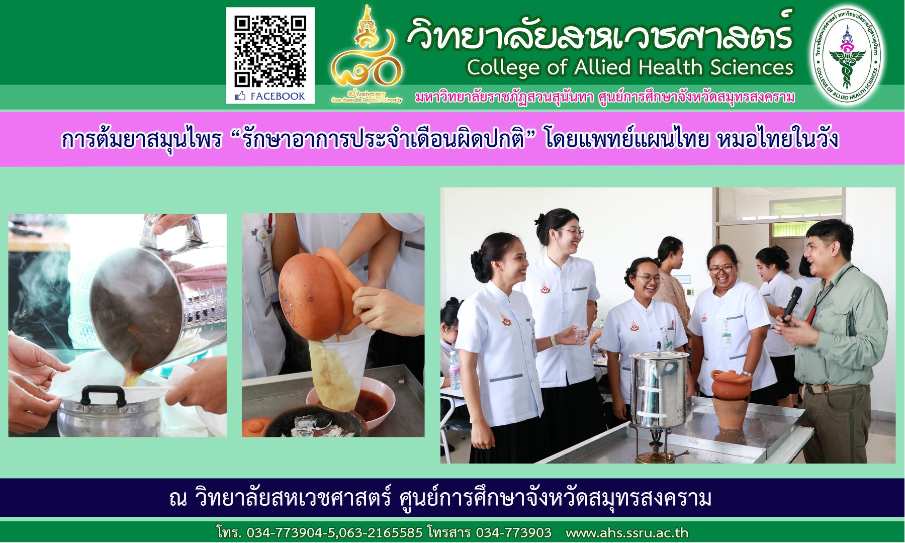 วันที่ 22 พฤศจิกายน 2562 อาจารย์นรินทร์ กากะทุม หัวหน้าสาขาวิชาการแพทย์แผนไทยประยุกต์ วิทยาลัยสหเวชศาสตร์ พร้อยอาจารย์ประจำสาขา ให้นักศึกษาชั้นปีที่ 3 ฝึกการต้มยาสมุนไพร หัวข้อยาต้มรักษาประจำเดือนผิดปกติ ในรายวิชาเภสัชกรรมไทย 3 ทำให้นักศึกษาได้หลักการเลือกสมุนไพร เลือกอุปกรณ์ ความแตกต่างของรสยาจากหม้อชนิดต่างๆ การรับประทานและการให้คำแนะนำอย่างถูกต้อง ณ วิทยาลัยสหเวชศาสตร์ ศูนย์การศึกษาจังหวัดสมุทรสงคราม