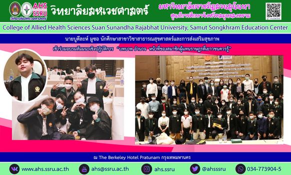 นายบูดีละห์ มูซอ นักศึกษาสาขาวิชาสาธารณสุขศาสตร์และการส่งเสริมสุขภาพ วิทยาลัยสหเวชศาสตร์ มหาวิทยาลัยราชภัฏสวนสุนันทา วิทยาเขตสมุทรสงคราม เป็นตัวแทนจากจังหวัดสมุทรสงคราม