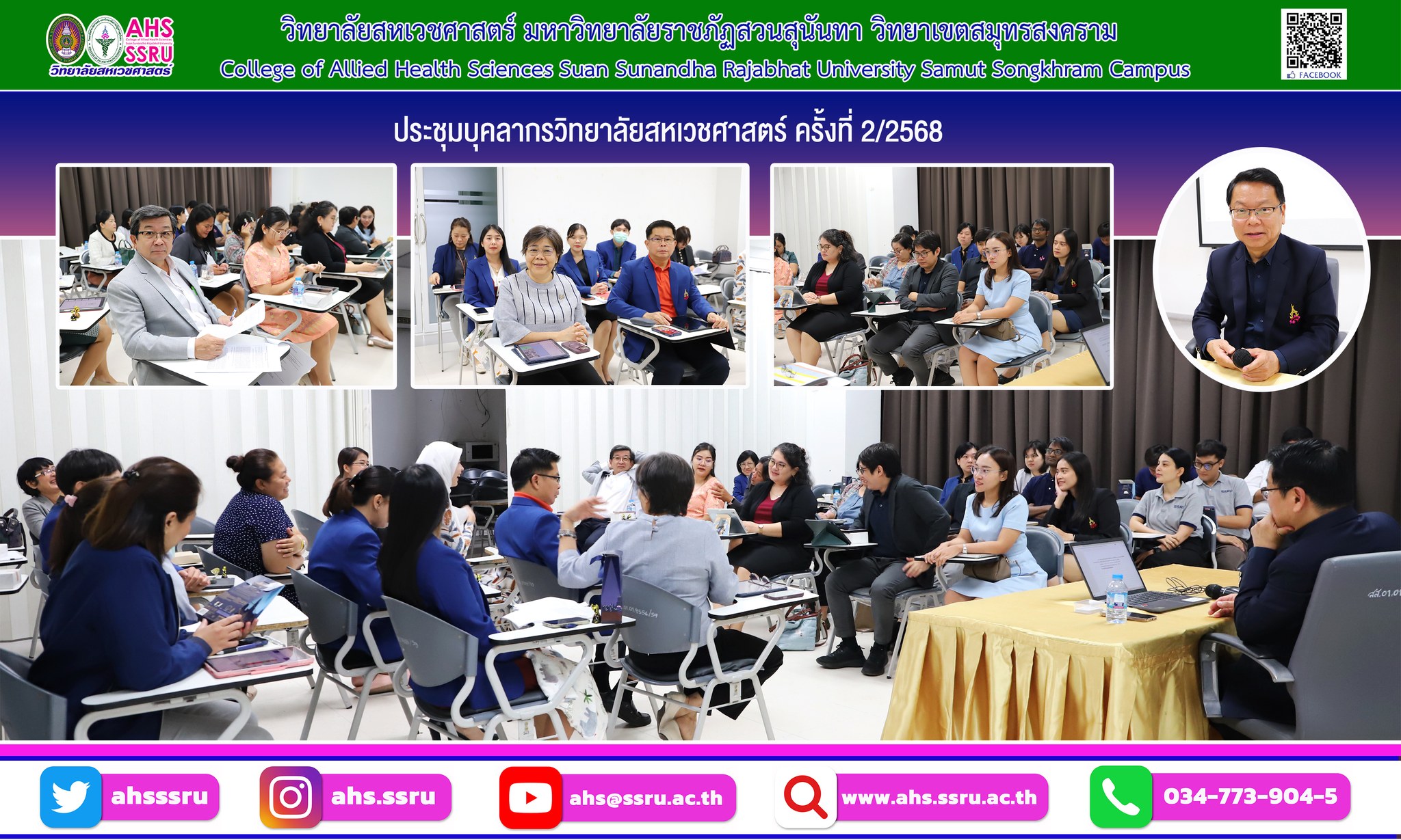 รองศาสตราจารย์ ดร.สมเดช รุ่งศรีสวัสดิ์ คณบดีวิทยาลัยสหเวชศาสตร์ มหาวิทยาลัยราชภัฏสวนสุนันทา วิทยาเขตสมุทรสงคราม เป็นประธานประชุม ครั้งที่ 2/2568 กับบุคลากร คณาจารย์ และเจ้าหน้าที่สายสนับสนุนวิชาการ
