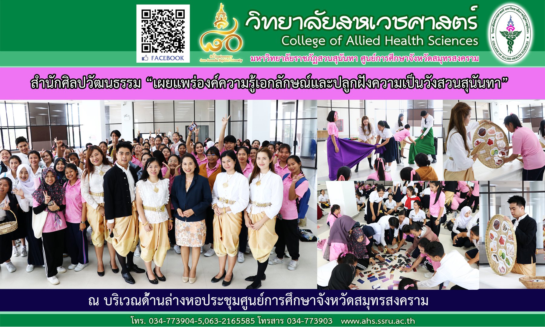 เมื่อวันที่ 26 เมษายน 2562 อาจารย์ ดร.พรรณี โรจนเบญจกุล รองคณบดีฝ่ายกิจการนักศึกษา วิทยาลัยสหเวชศาสตร์ ให้การต้อนรับบุคลากรจากสำนักศิลปวัฒนธรรม มหาวิทยาลัยราชภัฏสวนสุนันทา ในการจัดโครงการเผยแพร่องค์ความรู้เอกลักษณ์และปลูกฝังความเป็นวังสวนสุนันทา ให้กับนักศึกษา ชั้นปีที่ 1 ทั้งนี้ ฝ่ายกิจการนักศึกษาขอขอบคุณ ผู้อำนวยการศูนย์การศึกษาจังหวัดสมุทรสงคราม ที่เอื้อเฟื้อสถานที่ และขอบคุณคณาจารย์ที่อนุญาตให้นักศึกษา ชั้นปีที่ 1 เข้าร่วมกิจกรรมในครั้งนี้ ณ บริเวณด้านล่างหอประชุมศูนย์การศึกษาจังหวัดสมุทรสงคราม