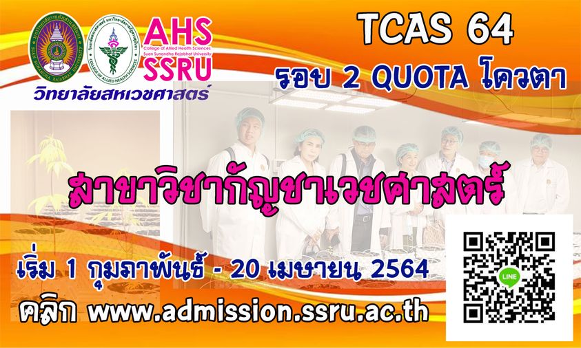 สาขาวิชากัญชาเวชศาสตร์ วิทยาลัยสหเวชศาสตร์ มหาวิทยาลัยราชภัฏสวนสุนันทา ศูนย์การศึกษาจังหวัดสมุทรสงคราม รับสมัครบุคคลเพื่อคัดเลือกเข้าศึกษาระดับปริญญาตรี ภาคปกติ ประเภทความสามารถทางวิชาการ/ประเภทความสามารถพิเศษ ประจำปีการศึกษา 2564 (รอบที่ 2 Quota) รับสมัครทาง Internet ที่ www.admission.ssru.ac.th เริ่ม วันที่ 1 กุมภาพันธ์ – 20 เมษายน 2564 ค่ะ...พี่ๆรอน้องๆอยู่นะคะ...
