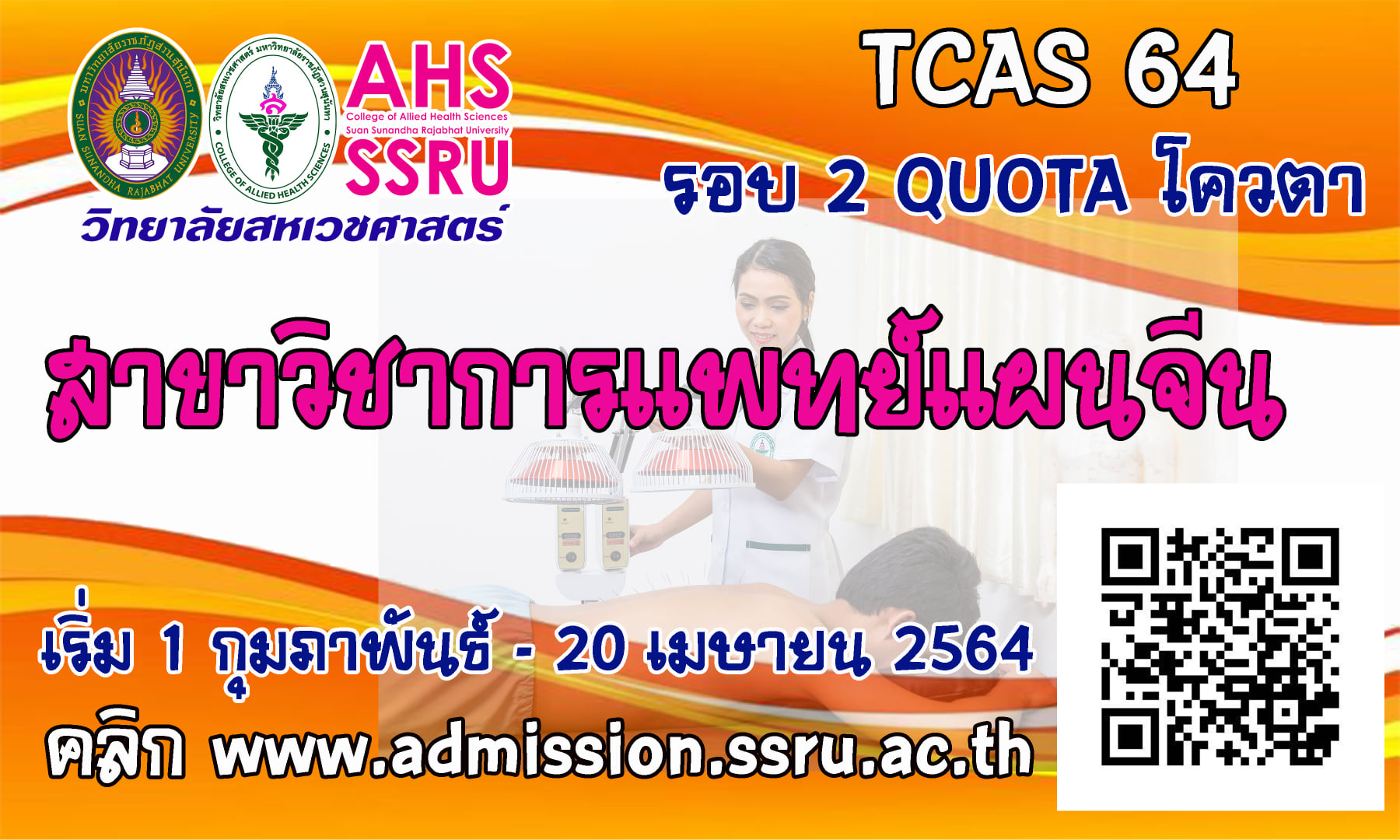 สาขาวิชาการแพทย์แผนจีน วิทยาลัยสหเวชศาสตร์ มหาวิทยาลัยราชภัฏสวนสุนันทา ศูนย์การศึกษาจังหวัดสมุทรสงคราม รับสมัครบุคคลเพื่อคัดเลือกเข้าศึกษาระดับปริญญาตรี ภาคปกติ ประเภทความสามารถทางวิชาการ/ประเภทความสามารถพิเศษ ประจำปีการศึกษา 2564 (รอบที่ 2 Quota) รับสมัครทาง Internet ที่ www.admission.ssru.ac.th เริ่ม วันที่ 1 กุมภาพันธ์ – 20 เมษายน 2564 ค่ะ...พี่ๆรอน้องๆอยู่นะคะ...