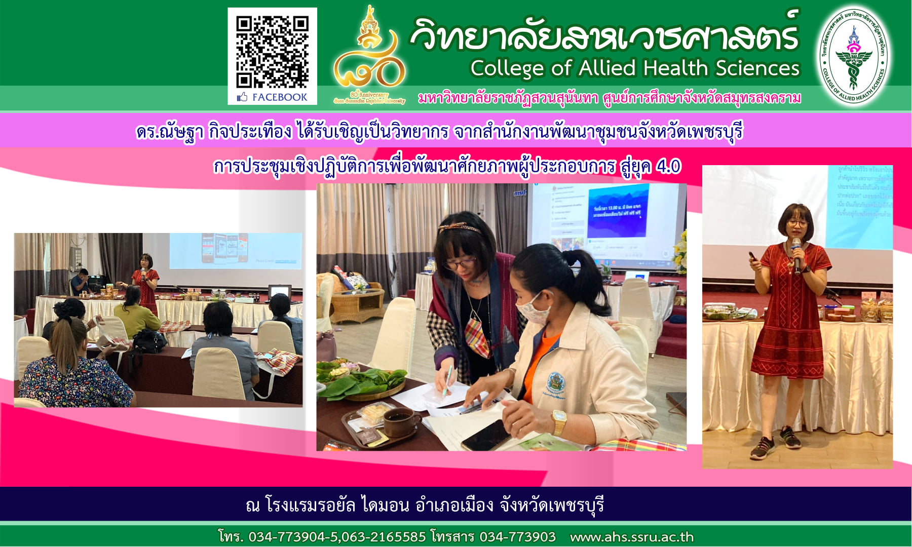 วันที่ 24-25 กุมภาพันธ์ 2564 ดร.ณัษฐา กิจประเทือง อาจารย์วิทยาลัยสหเวชศาสตร์ มรภ.สวนสุนันทา ศูนย์การศึกษาจังหวัดสมุทรสงคราม ได้รับเชิญจากสำนักงานพัฒนาชุมชนจังหวัดเพชรบุรี เป็นวิทยากรในการประชุมเชิงปฏิบัติการเพื่อพัฒนาศักยภาพผู้ประกอบการสู่ยุค 4.0