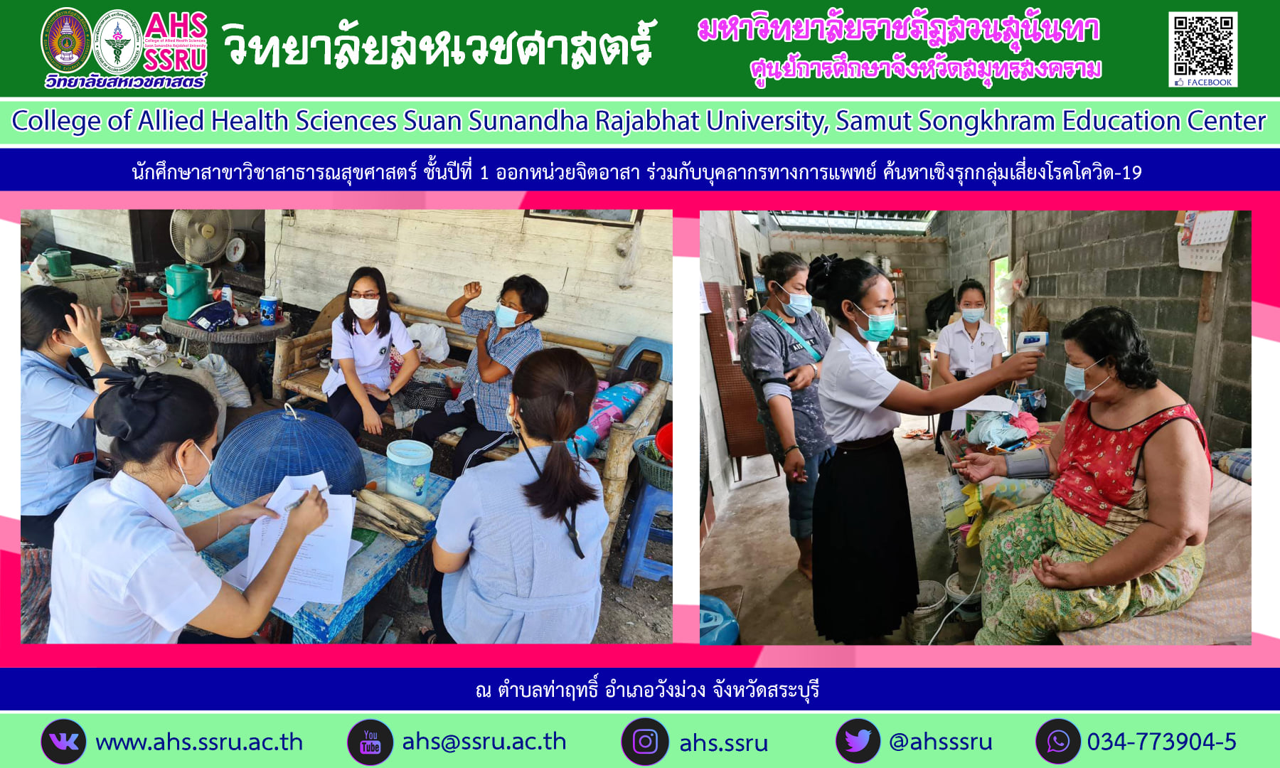 วันที่ 9 เมษายน 2564 ดร.ธรรมศักดิ์ สายแก้ว หัวหน้าสาขาวิชาสาธารณสุขศาสตร์ วิทยาลัยสหเวชศาสตร์ มหาวิทยาลัยราชภัฏสวนสุนันทา ศูนย์การศึกษาจังหวัดสมุทรสงคราม นำนักศึกษาสาขาวิชาสาธารณสุขศาสตร์ ชั้นปีที่ 1 เข้าร่วมกิจกรรมจิตอาสาปฏิบัติงานในหน่วยบริการปฐมภูมิ ร่วมกับ บุคลากรทางการแพทย์ในโรงพยาบาลส่งเสริมสุขภาพตำบลท่าฤทธิ์ อำเภอวังม่วง จังหวัดสระบุรี ออกคัดกรอง ค้นหาเชิงรุกกลุ่มเสี่ยงโรคโควิค 2019 (active case finding) ในพื้นที่
