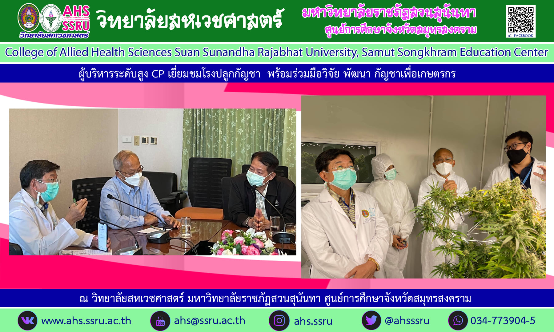 วันที่ 11 มิถุนายน 2564 รองศาสตราจารย์ (พิเศษ) ดร.นพ.ธวัชชัย กมลธรรม ประธานหลักสูตรกัญชาเวชศาสตร์ วิทยาลัยสหเวชศาสตร์ มหาวิทยาลัยราชภัฏสวนสุนันทา ให้การต้อนรับผู้บริหารระดับสูงจาก CP ในโอกาสที่มาเยี่ยมชมโรงปลูกกัญชาในระบบปิด Medical Grade ของวิทยาลัยสหเวชศาสตร์ ศูนย์การศึกษามหาวิทยาลัยราชภัฏสวนสุนันทา จังหวัดสมุทรสงคราม ซึ่งคณะผู้บริหารจาก CP ชื่นชมและยกย่องว่าโรงปลูกกัญชาของวิทยาลัยสหเวชศาสตร์ได้มาตรฐานระดับโลก สามารถนำผลผลิตไปใช้ทำยารักษาโรค และผลิตภัณฑ์เพื่อสุขภาพได้อย่างแน่นอน